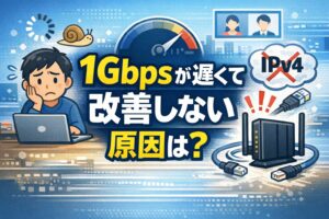 通信速度が遅い原因を「回線が悪い」「ルーターが古い」と思い込み、 接続方式(IPv4/IPv6)を確認していないケースも多く見られます。しかし、1Gbps回線では接続方式の違いが体感速度に直結します。